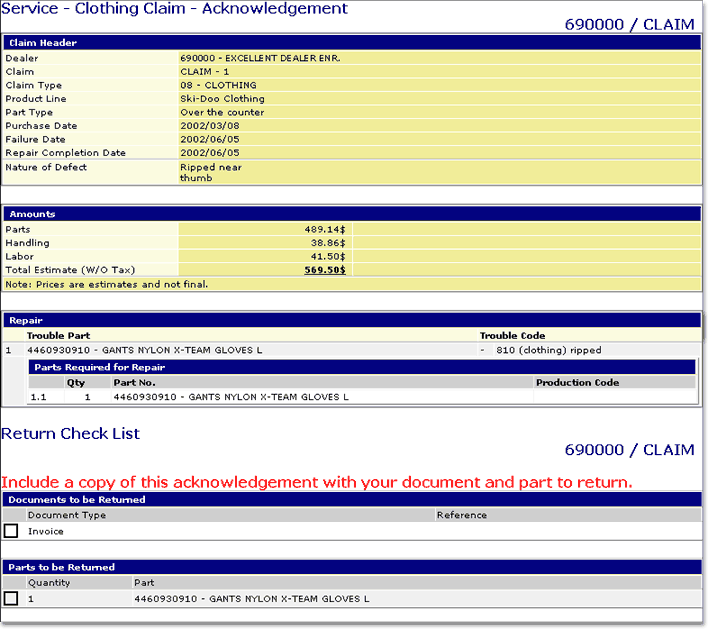 screen provides to the dealer a summary report of the claim